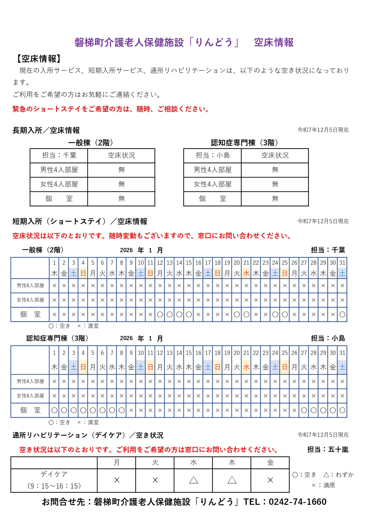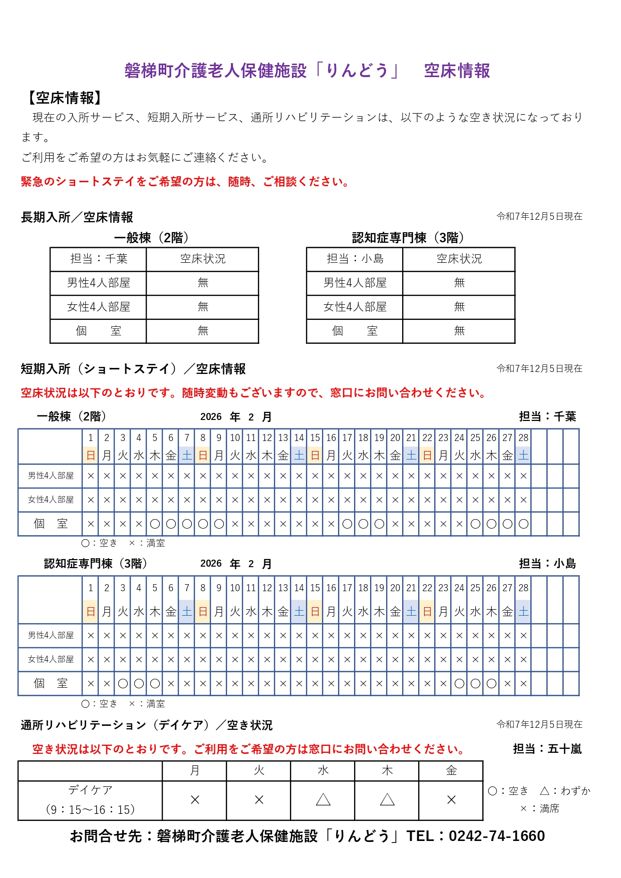 【R7.12.4更新】空床情報(R7.12~R8.2) 2025.12.4 介護老人保健施設 りんどう 磐梯町介護老人保健施設「りんどう」 入所サービス、短期入所サービス、通所リハビリテーションの空き状況をご案内いたします。 令和7年12月 令和8年1月 令和8年2月 Tweet Share +1 Hatena Pocket RSS feedly Pin it 介護老人保健施設 りんどう