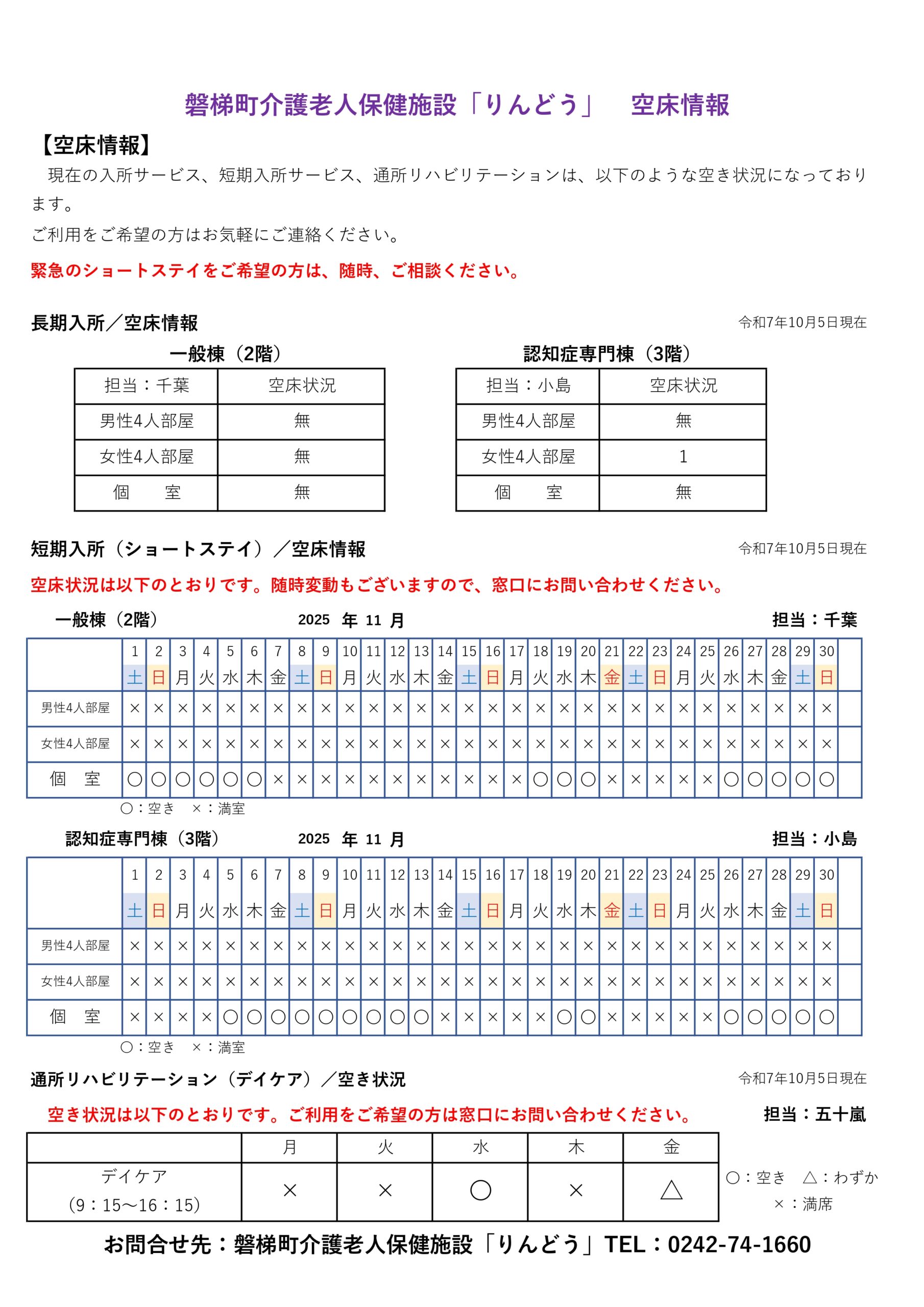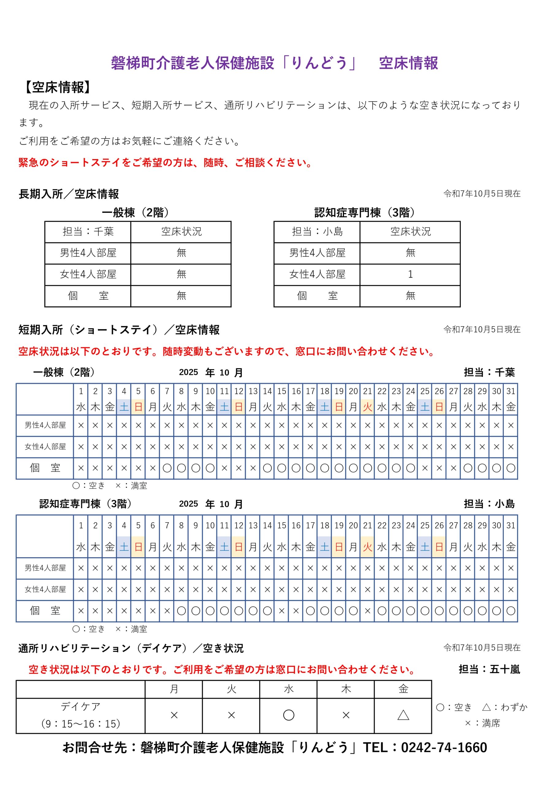 【R7.10.9更新】空床情報(R7.10~R7.12) 2025.10.9 介護老人保健施設 りんどう 磐梯町介護老人保健施設「りんどう」 入所サービス、短期入所サービス、通所リハビリテーションの空き状況をご案内いたします。 令和7年10月 令和7年11月 令和7年12月 Tweet Share +1 Hatena Pocket RSS feedly Pin it 介護老人保健施設 りんどう