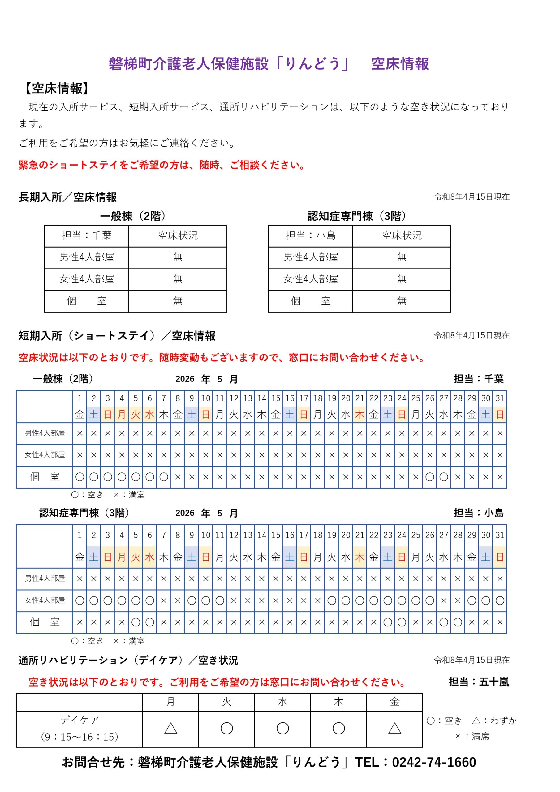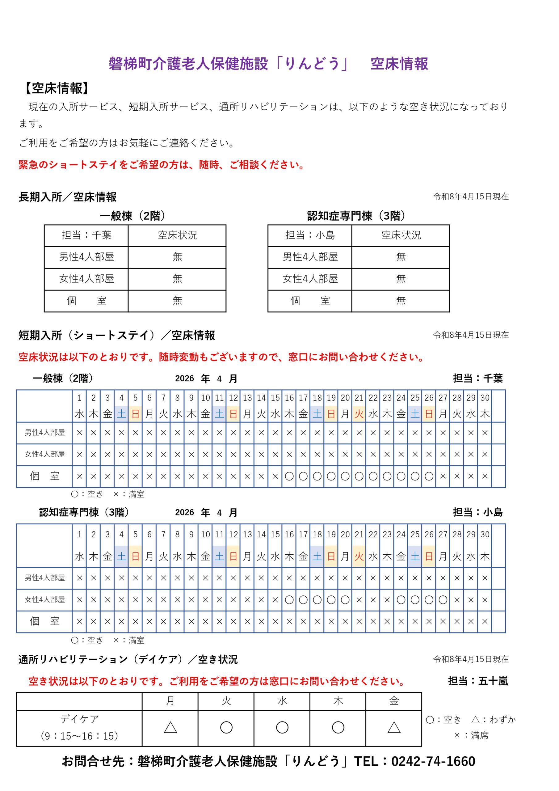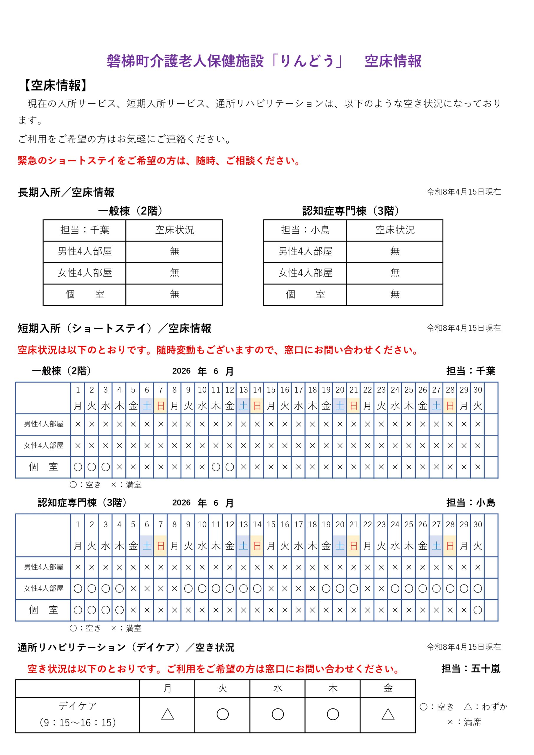 【R8.4.15更新】空床情報(R8.4~R8.6) 2026.04.15 介護老人保健施設 りんどう 磐梯町介護老人保健施設「りんどう」 入所サービス、短期入所サービス、通所リハビリテーションの空き状況をご案内いたします。 令和8年4月 令和8年5月 令和8年6月 Tweet Share +1 Hatena Pocket RSS feedly Pin it 介護老人保健施設 りんどう